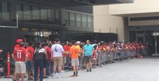 احتشدت جماهير ليفربول الإنجليزي، خارج فندق إقامة لاعبي الريدز بالولايات المتحدة الأمريكية؛ لمؤازرتهم استعدادا لمواجهة بوروسيا دورتموند الألماني، في إطار كأس الأبطال الدولية.