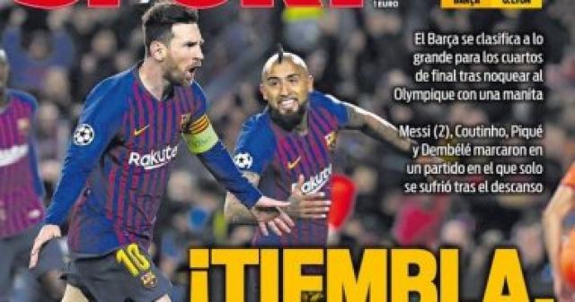 وعنونت صحيفة "سبورت"، "أوروبا تهتز.. برشلونة يتأهل لربع نهائي دوري الابطال بجدارة واستحقاق بعد فوزه الكبير على ليون بخماسية.. ميسي بهدفين، كوتينهو، بيكيه وديمبيلي، سجلوا أهداف البارسا"، مشيرة إلى أن برشلونة وجه إنذاراً شديد اللهجة لجميع منافسيه فى المسابقة بأهدافه الخمسة ضد ليون.